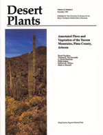 12, number 2 - $10 (includes postage) Annotated Flora & Vegetation of the Tucson Mountains, Pima County, Arizona. This is a publication by the University of Arizona for the Boyce Thompson Southwestern Arboretum, which comes out twice a year. Subscriptions are $20/year. Send to: Desert Plants, 2120 E Allen Rd., Tucson AZ 85719. |