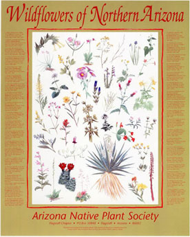 Wildflowers of Northern Arizona PosterThe Arizona Native Plant Society's beautiful new poster features illustrations of thirty-eight species of flowering plants that can be found in northern Arizona. The flowers depicted in this poster are but a small sample of the over 2500 species of flowering plants native to northern Arizona. Common and scientific names are provided along with a brief description. This 24" X 30" poster was illustrated and designed by Zackery Zdinak. Prices are listed below.