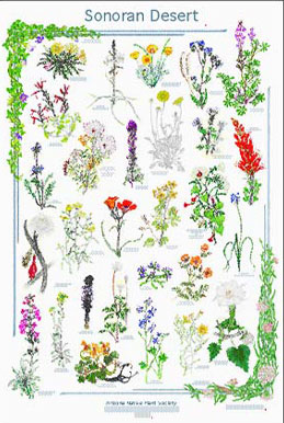 Sonoran Desert Wildflower PosterThis AZNPS poster features illustrations of thirty-two species of flowering plants that can be found in the Sonoran Desert. Common and scientific names are provided. The poster measures 24" X 36". Artist Margaret Pope has designed a poster that provides accurate rendering of the flowers and is also aesthetically very pleasing. If ordered from AZNPS, prices are: Shipping charge of $2.50 for first poster and $.50 for each additional poster mailed to the same address (U.S. addresses only). Wholesale Poster Price Posters are also available laminated for $20 each, then add $3.00 for shipping; $1 each for additional posters to the same address. Shipping and handling an additional charge dependent on the size of the order. Contact AZNPS for specifics on shipping costs. PAYMENT MUST BE INCLUDED WITH ORDER. |